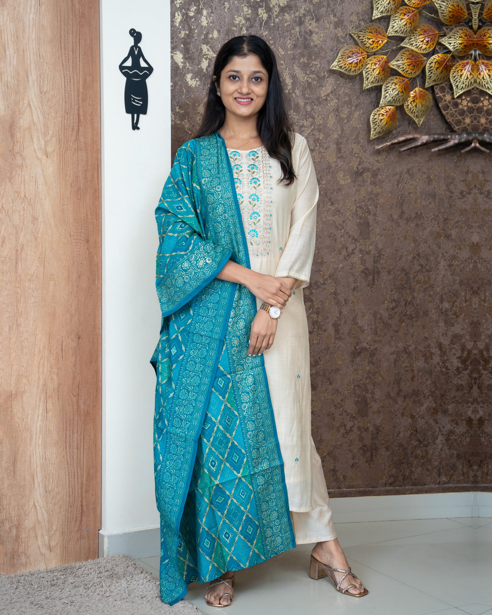 Top: Semi silk slitted kurti. Yoke and front highlighted with embroidery designs. Lace attached to the sleeve ends. With lining.