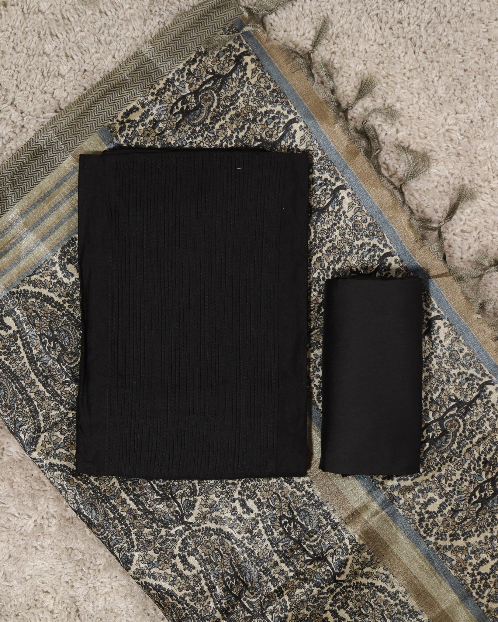 Top: Semi silk fabric. Middle highlighted with pin tucks. Length: 2.30mtr
