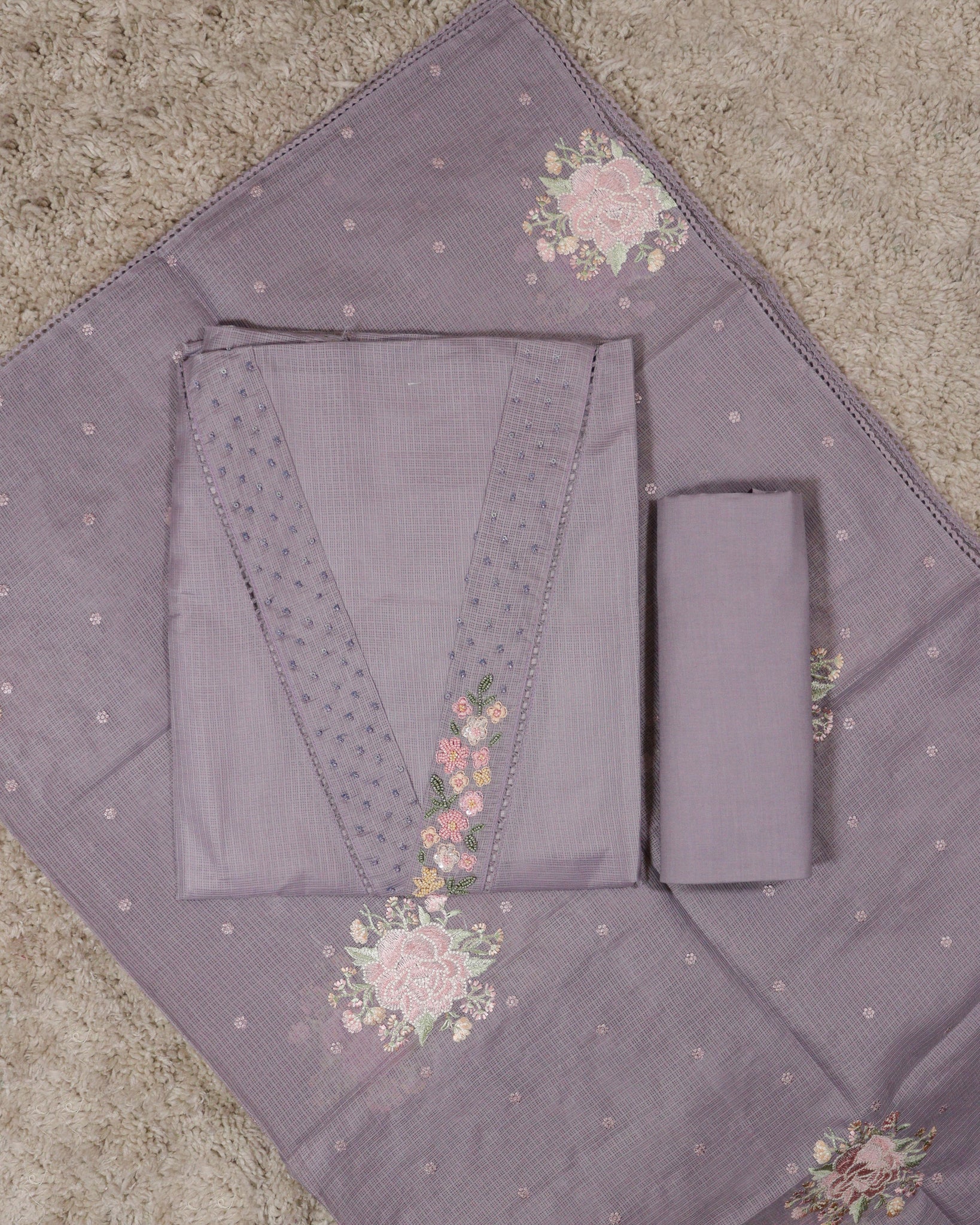 Dupatta: Silky kota dupatta with allover embroidery detailing. Sides finished with crochet lace. Length: 2.40mtr