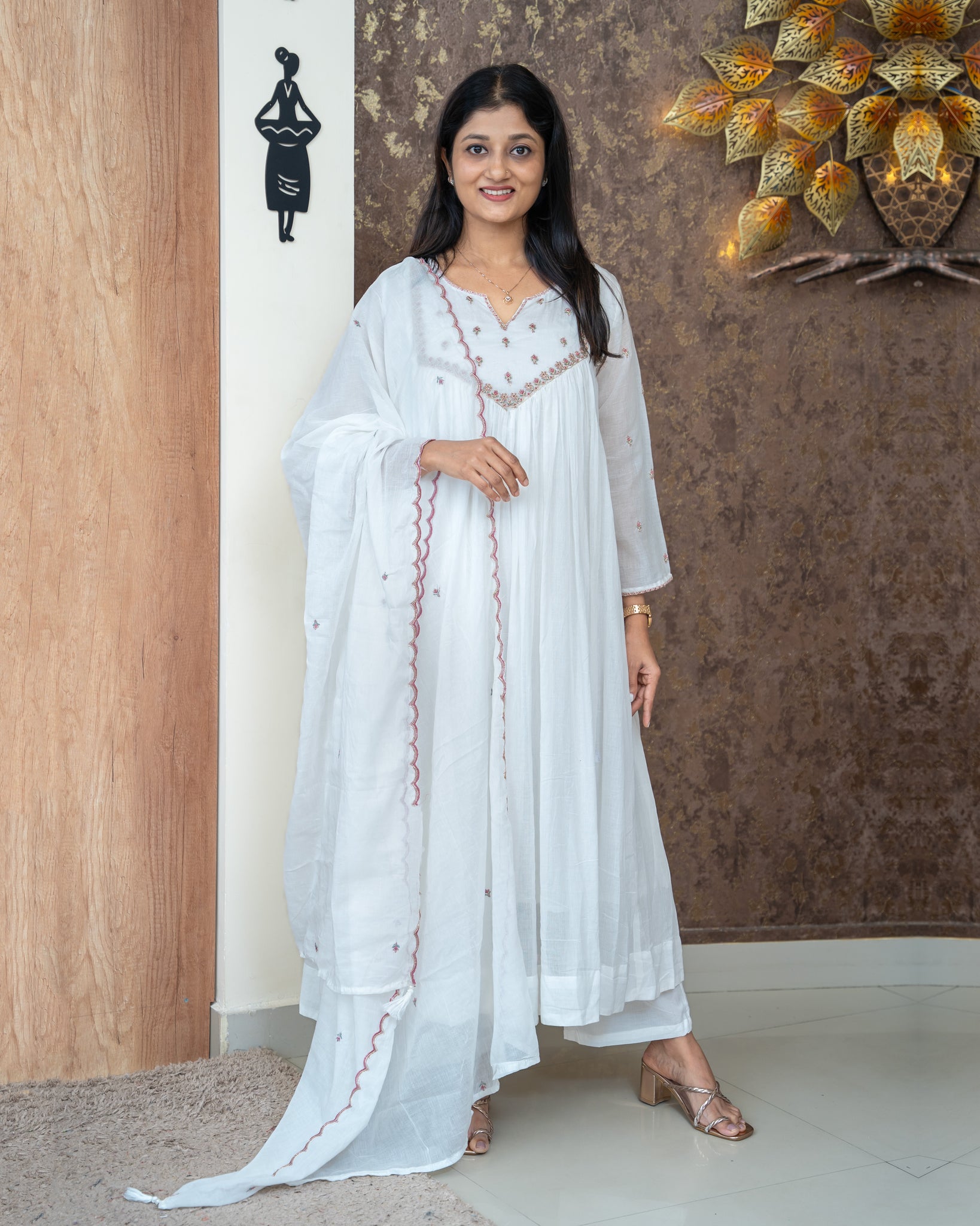 Dupatta: Mul cotton fabric with scallop and embroidery. Length- 2.25 meter