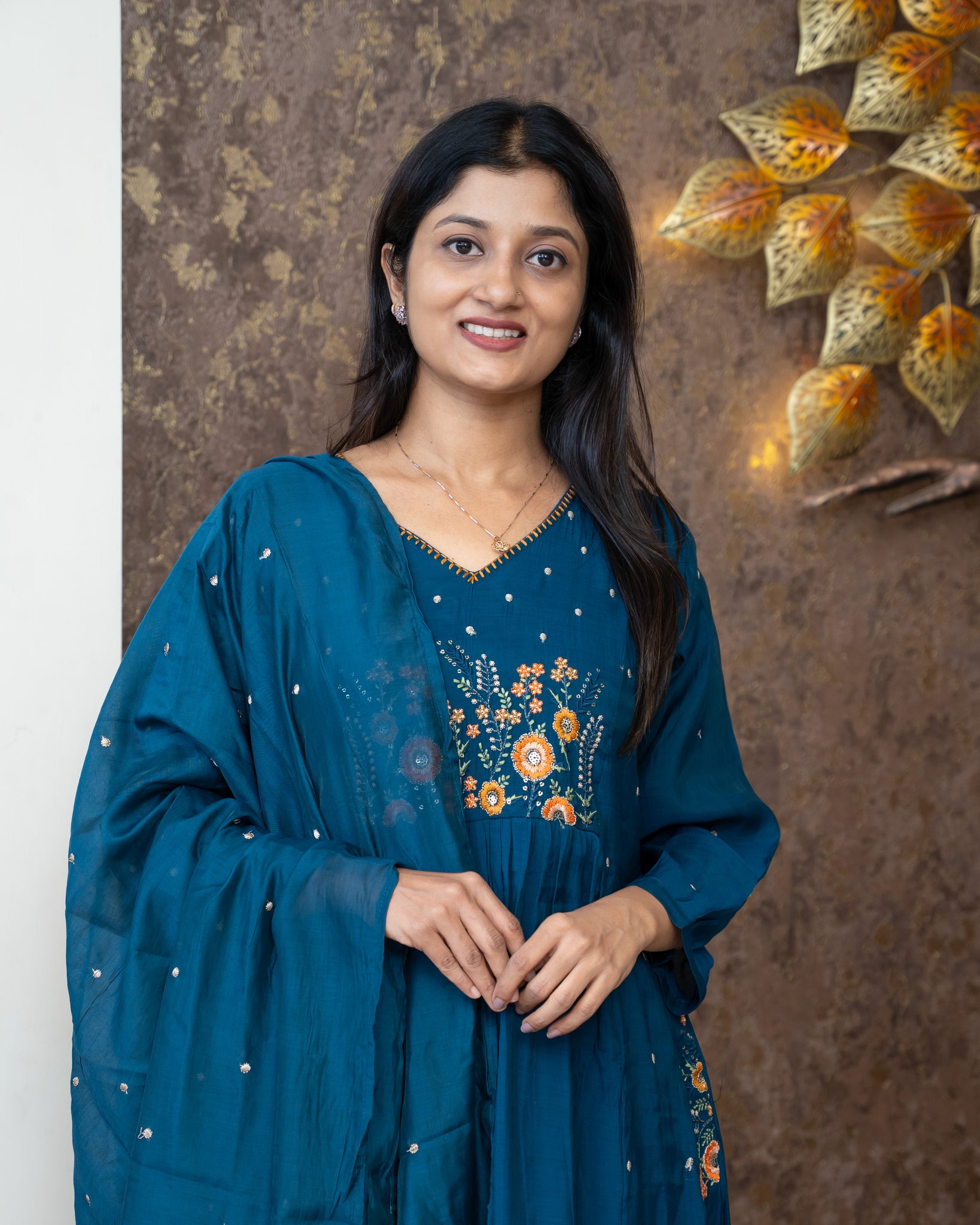 Top: A-line kurti. Neck and sleeves highlighted with hand work detailing. With lining.