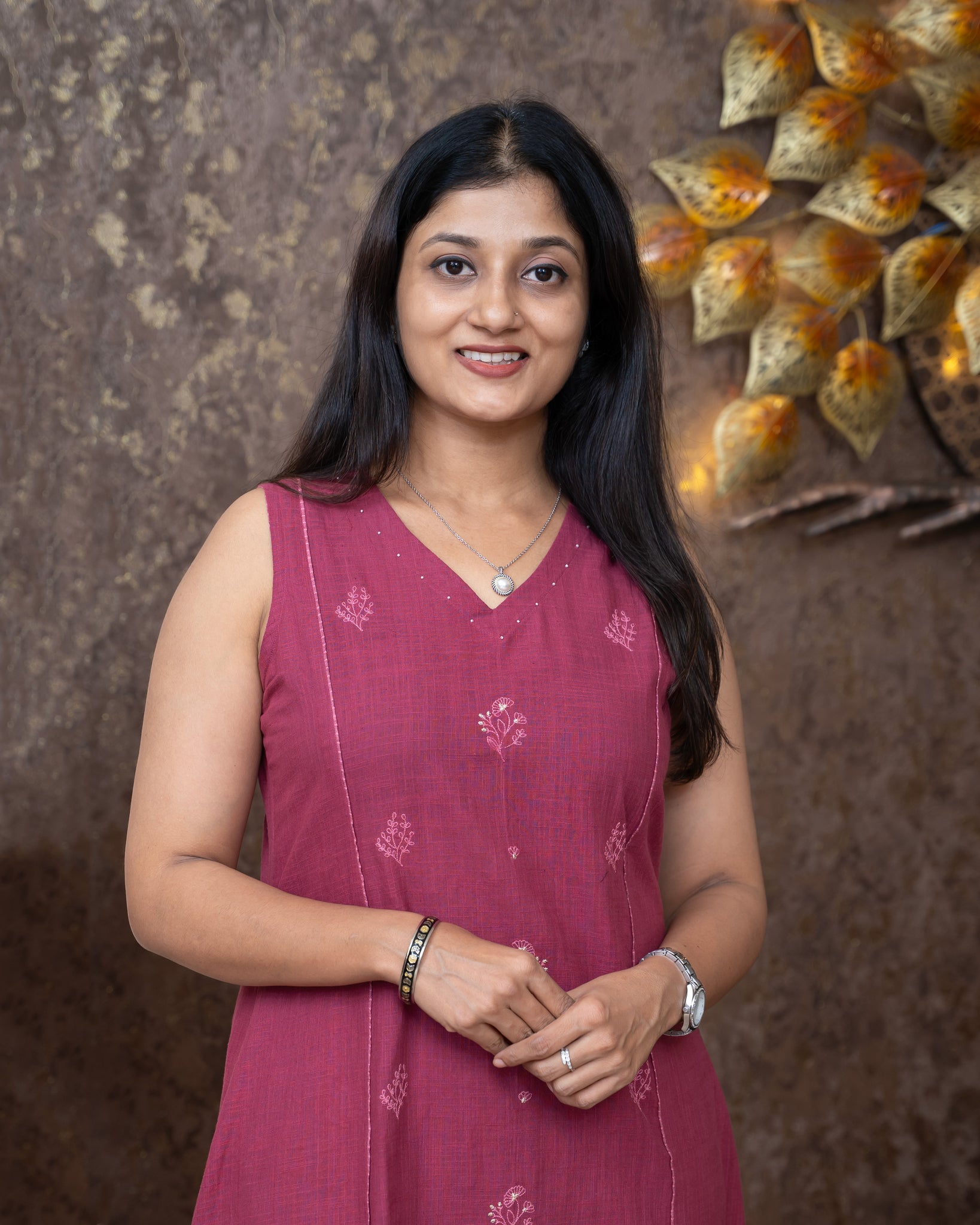 Top: Slitted A-line kurti. Three panel cut on front. Middle panel highlighted with embroidery detailing. Additional fabric available for short sleeves. Without lining.