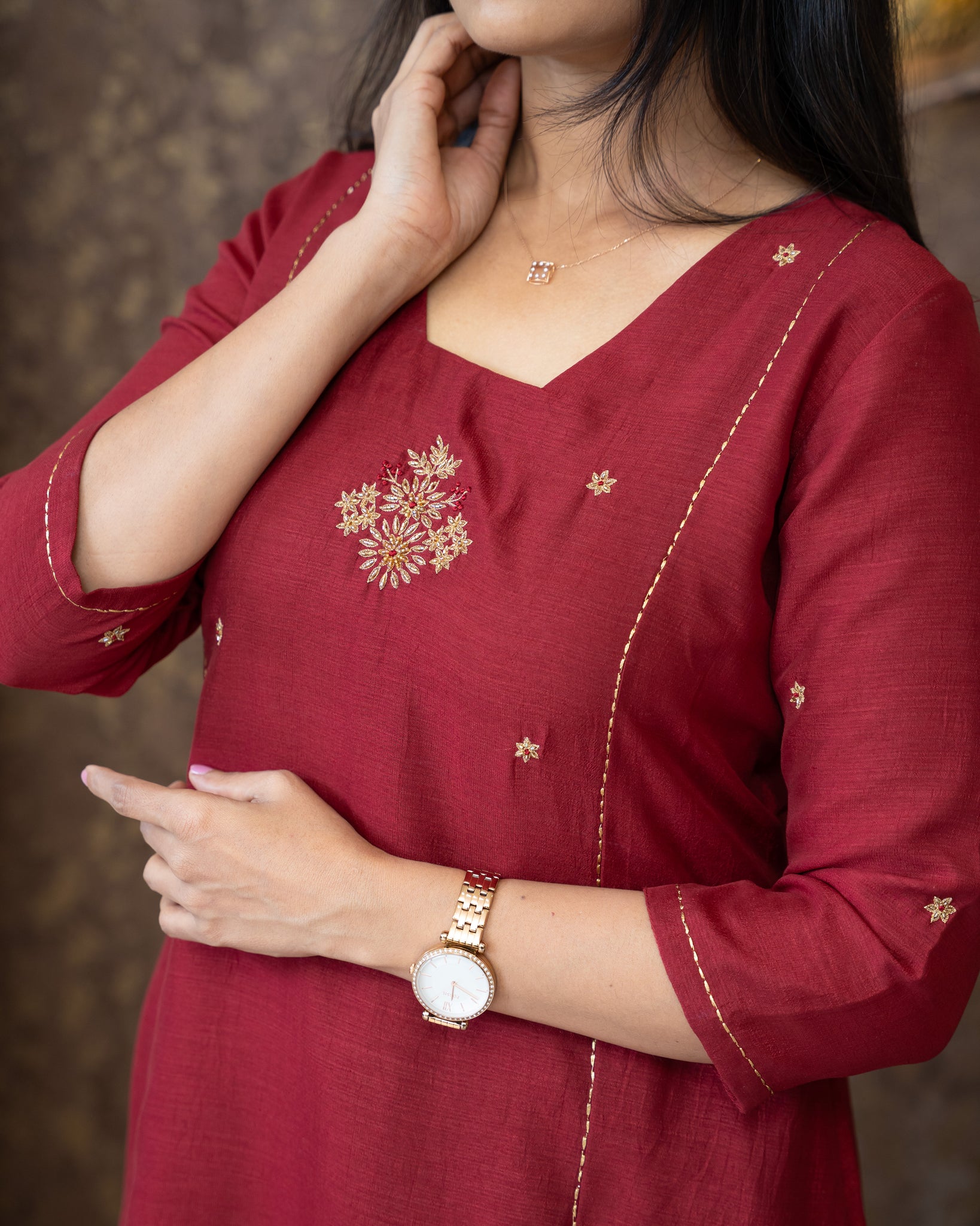 Top: Vichitra silk A-line kurti. Three panel cut on front, highlighted with running stitches. Yoke highlighted with embroidery detailing. Sleeves also features a scattered thread work motifs, Sleeve ends highlighted with running stitches. With lining