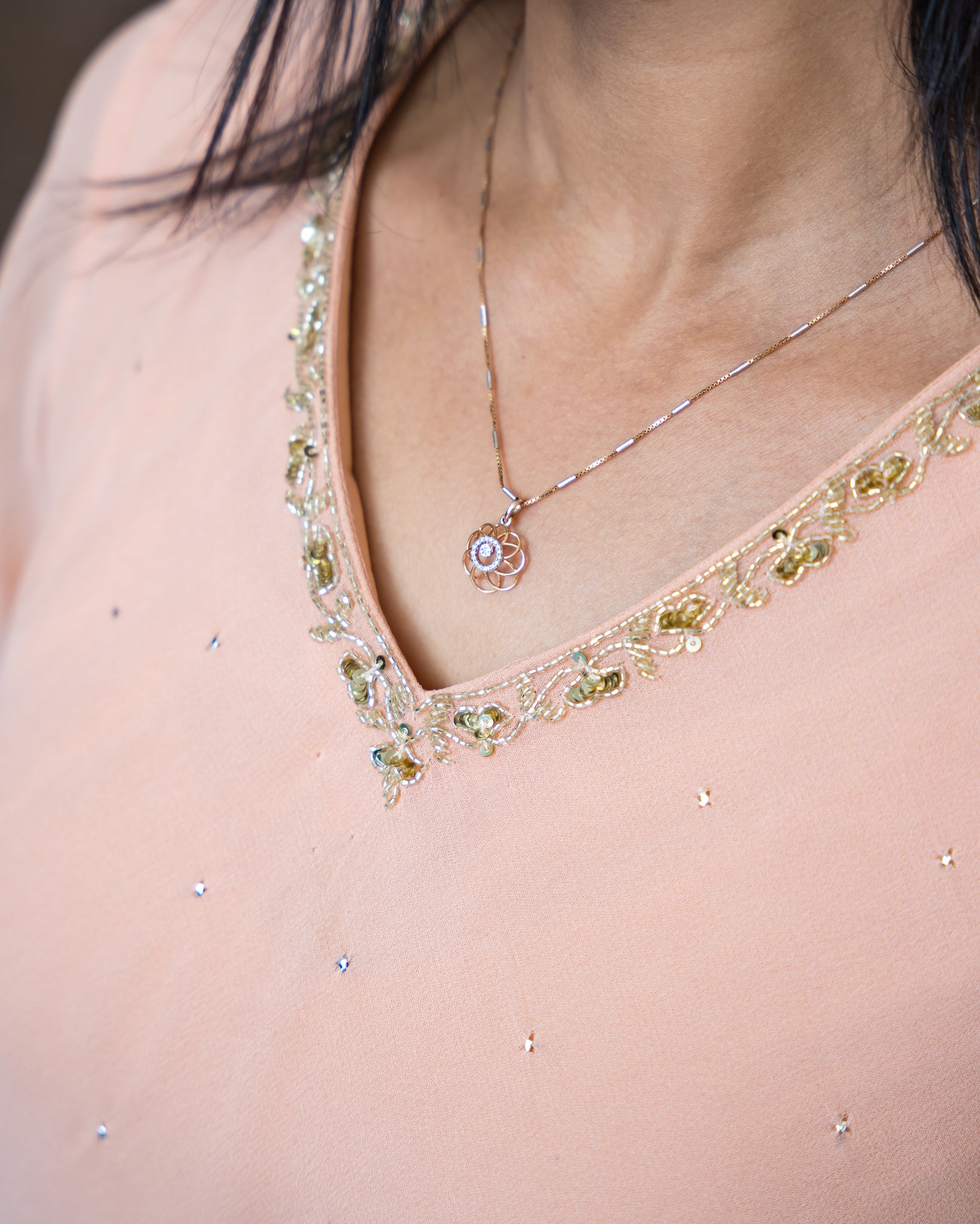 Top: Flared A-line. Neck highlighted with embroidery detailing. Flared sleeves. With lining(crepe).
